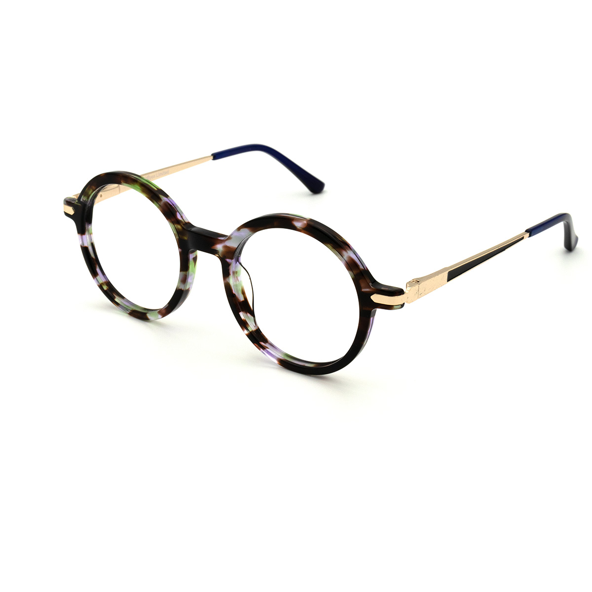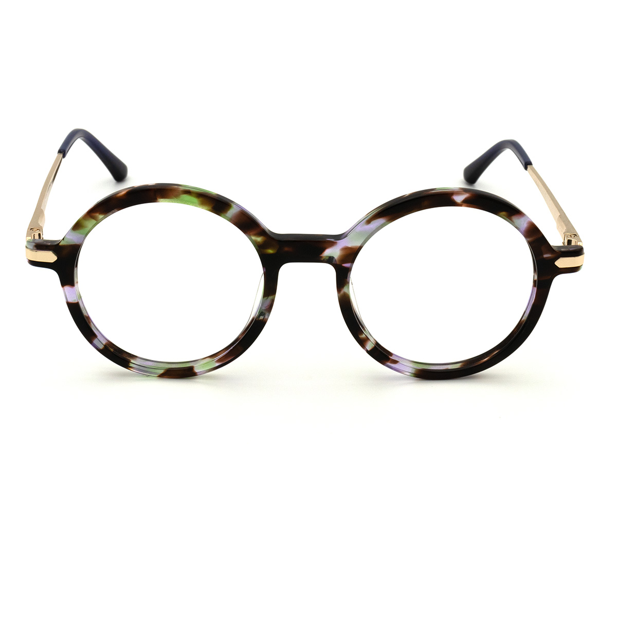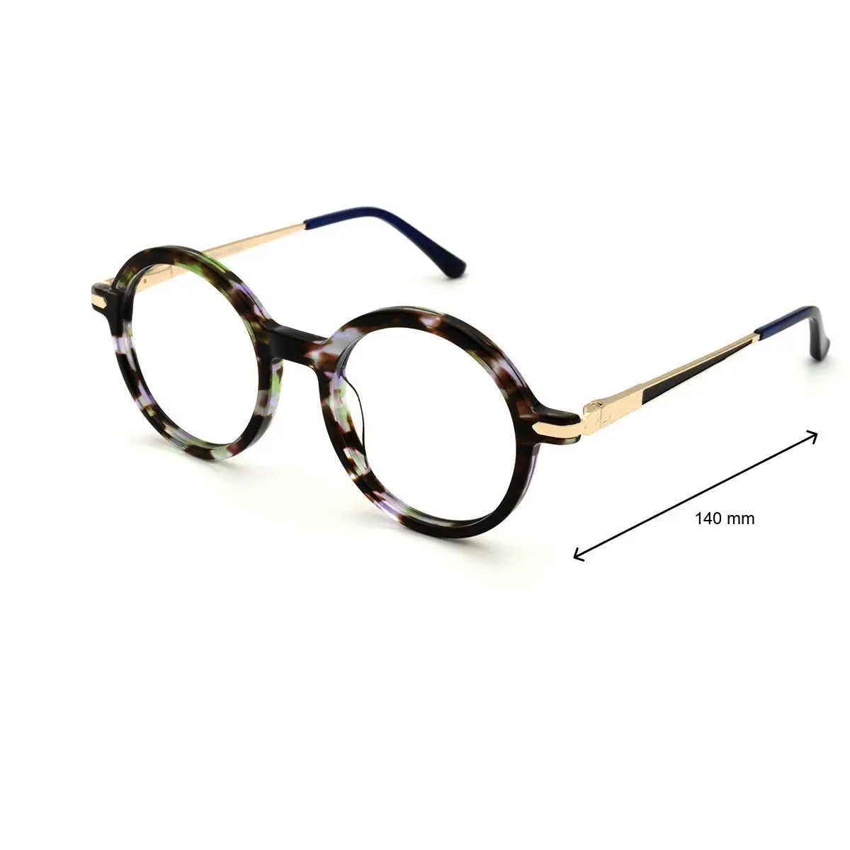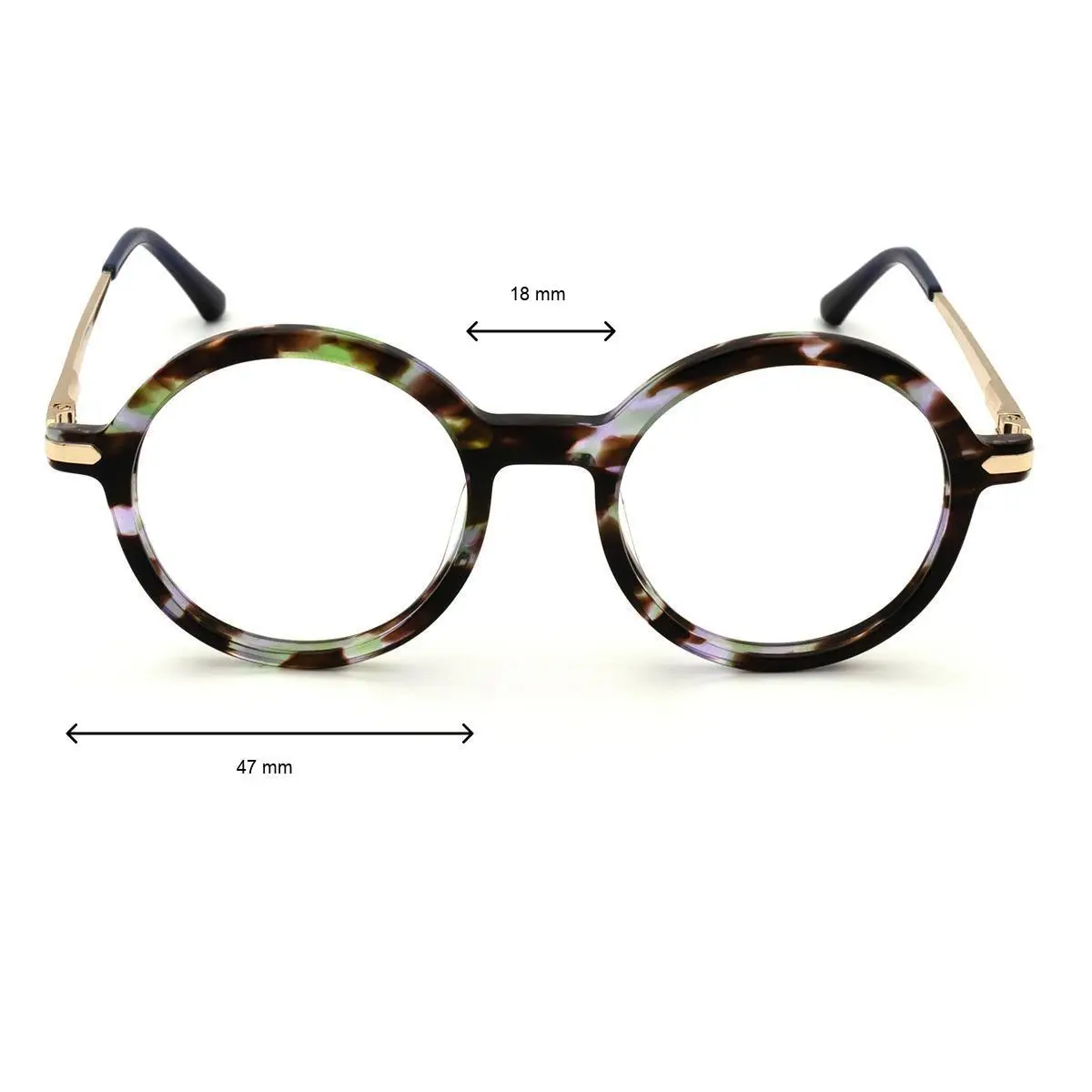 Denne runde acetatbrille fanger øjnene med sit levende, flertonede design, der blander mørkebrun, grøn, lilla og hvide nuancer i et fascinerende skildpaddemønster. Det kraftfulde farvepalette skaber en kunstnerisk effekt, der gør brillen til et statement-piece, som både komplimenterer og løfter enhver outfit.
