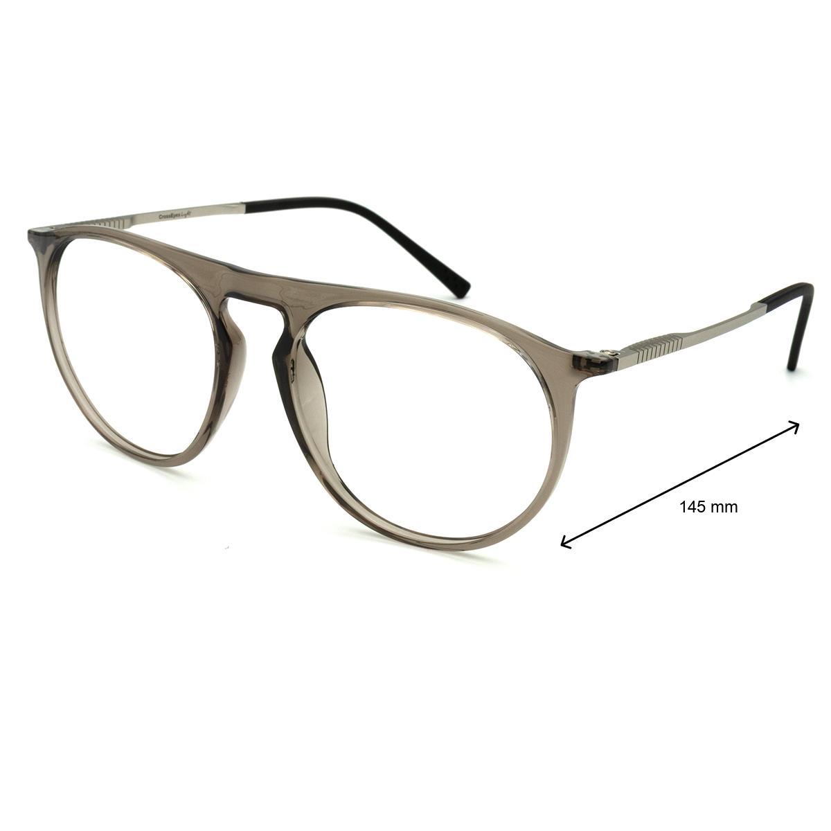 Disse aviator-inspirerede briller bringer et klassisk design ind i moderne tid med deres gennemsigtige grå front, der skaber et sofistikeret og samtidig afslappet udtryk. Den karakteristiske nøglehulsbro giver brillen et retro-præg, mens de afrundede glas balancerer det maskuline pilotlook med en blødere tilgang, der passer både mænd og kvinder.