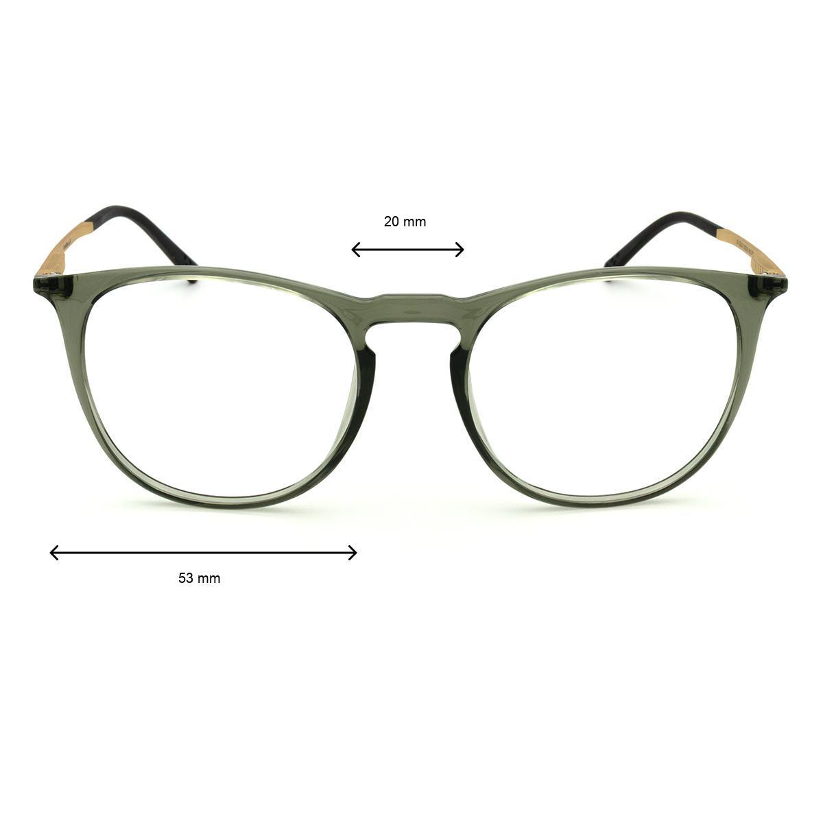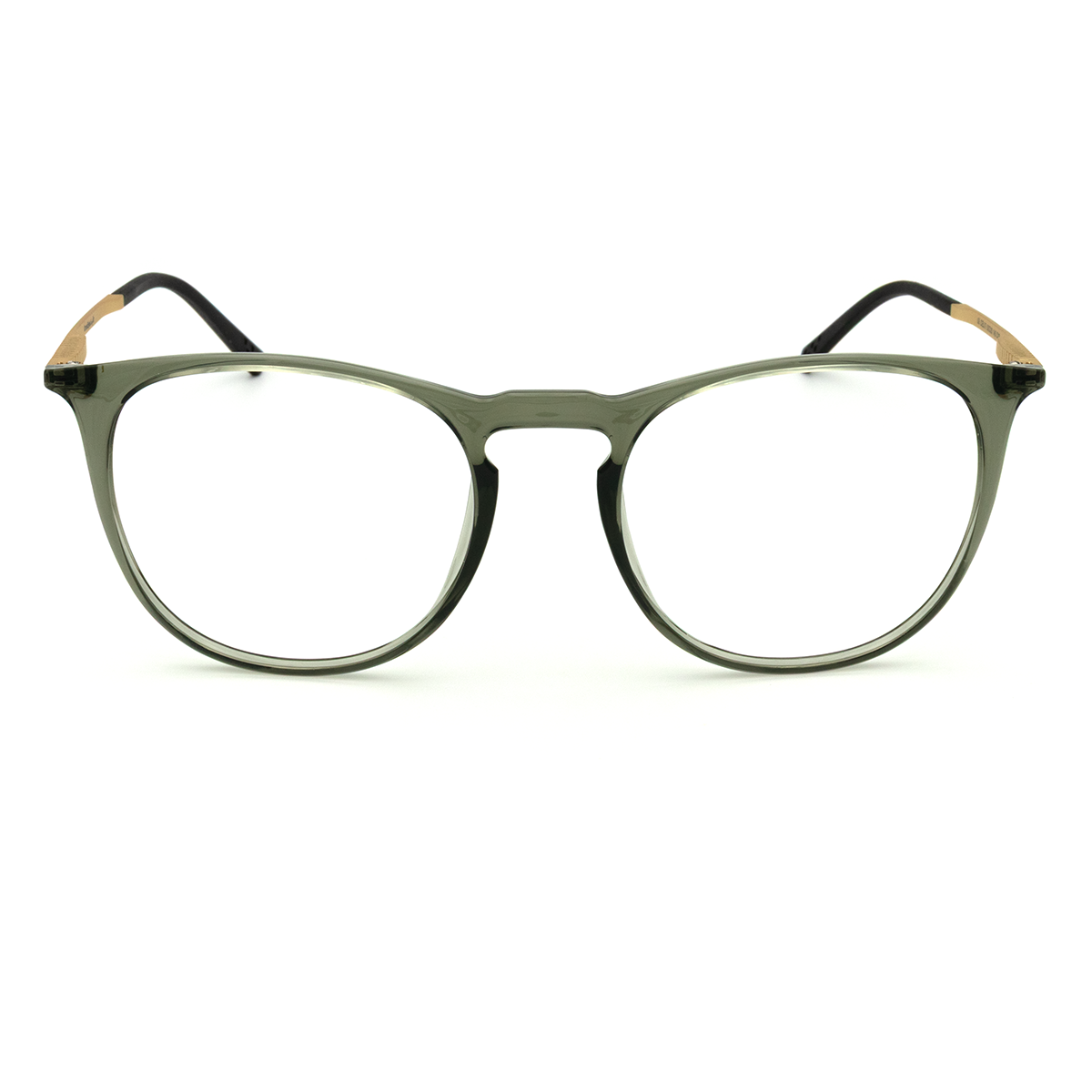 Brillen er fremstillet i TR90, et avanceret materiale kendt for sin fleksibilitet og holdbarhed. Dette sikrer en behagelig pasform dag efter dag, også ved længere tids brug. De sorte stænger skaber en fin kontrast til den grønne front, mens de elegante trædetaljer ved hængslerne tilføjer et raffineret naturligt element. Den slanke bro og det minimalistiske design uden synlige skruer på fronten giver brillen et rent og moderne udtryk.